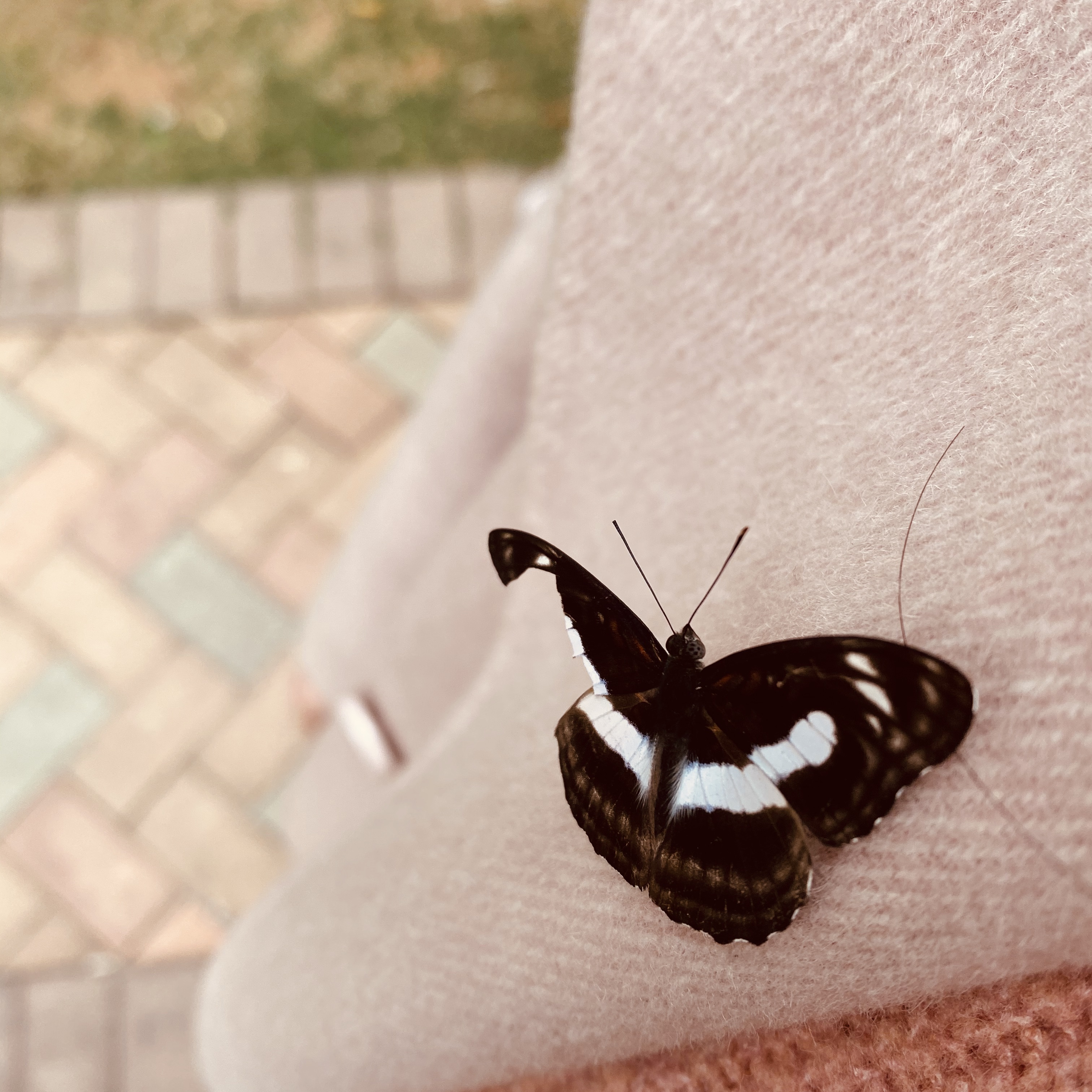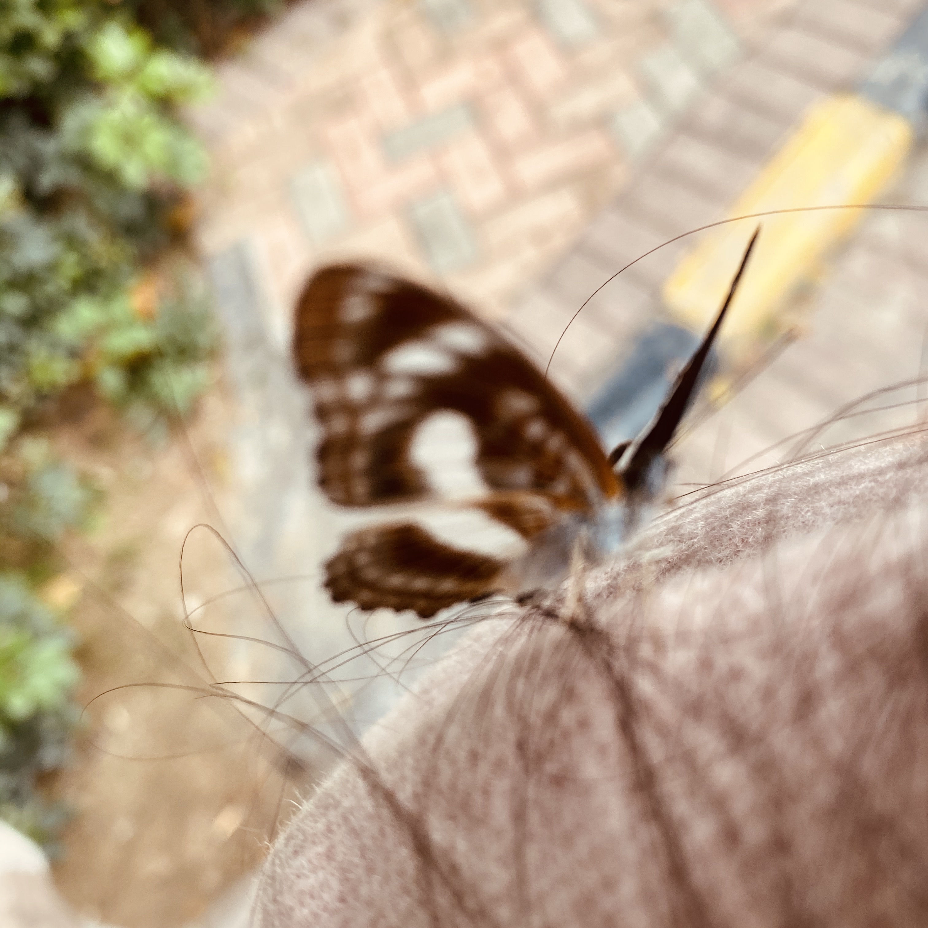 早上在外面走着,本是平平淡淡的一段路,可突然间,有只蝴蝶停在衣服上,我以为它不到几秒就会飞走了,可它没有,仿佛也不着急似的,我连忙拿出手机给它拍照。我尽量不动我的上身,而它也似乎丝毫不受影响似的,仍旧一动不动地停在那里。虽然后来,它有点迟疑似地往后,往我的头发上移动,可它仍旧没有飞走的意向。直到我拍了好几张照片,它还是停在那里。等它停在我的头发上那时,我已然看不太清它的样子了。照我看来,它没有受伤,我身上也没有芬芳气味,黑色的头发断也无法与鲜花媲美,它是因为什么迟迟逗留呢。后来,我轻轻地动了一下头发,它才一个转身,像起舞般飞走了。