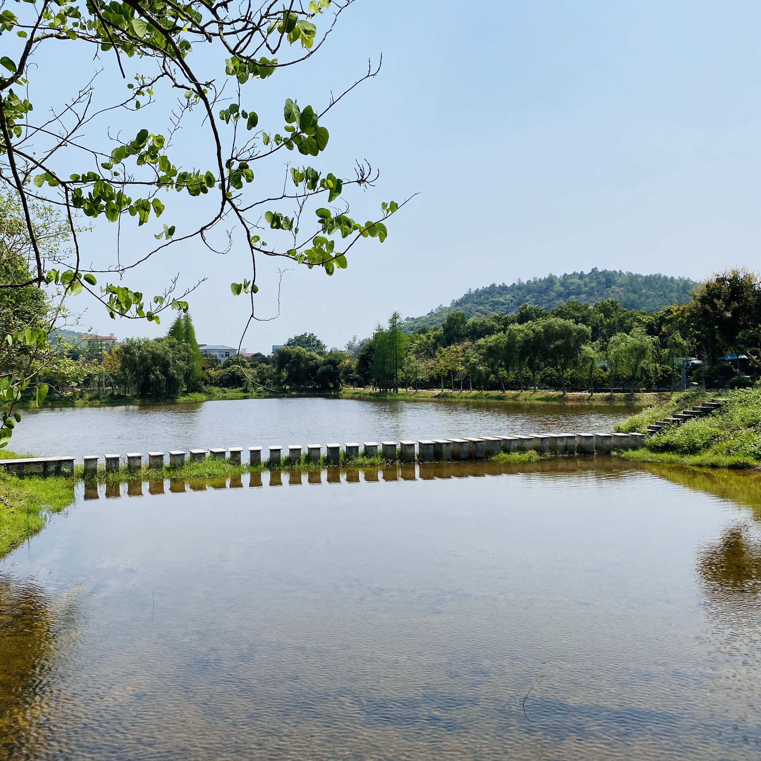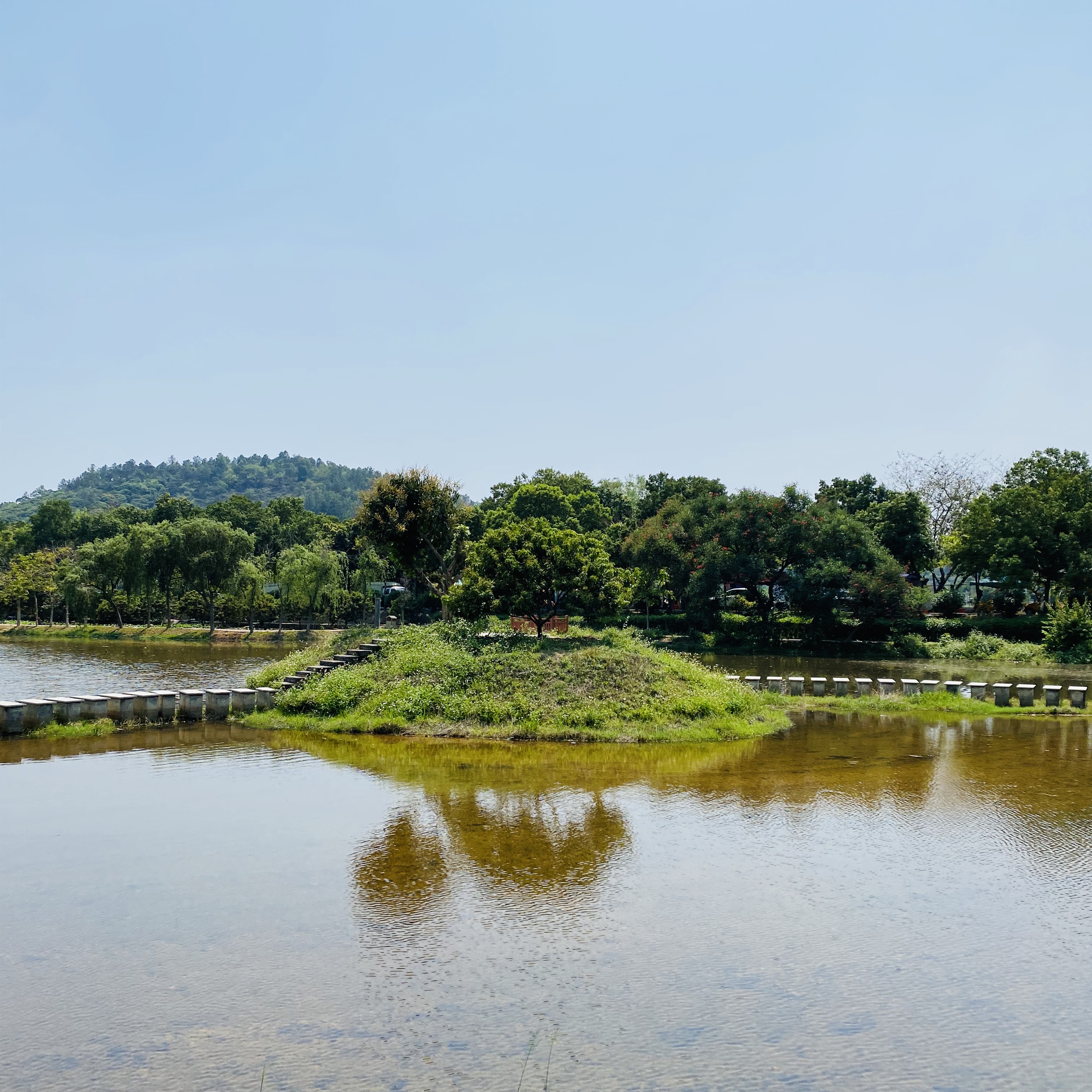 池塘的中心立有像多米诺骨牌一般的石头,可以直接从池塘的这边走到那边。我感觉这道石桥是池塘最美的地方,奇怪的是没看到有人在上面走。可能是耐不住太阳光吧。我好奇般走上去了。石头与石头之间有点缝隙,一边走着还要一边注意脚下,别一不小心走岔了。走完这道石桥,便觉得可以离开了。