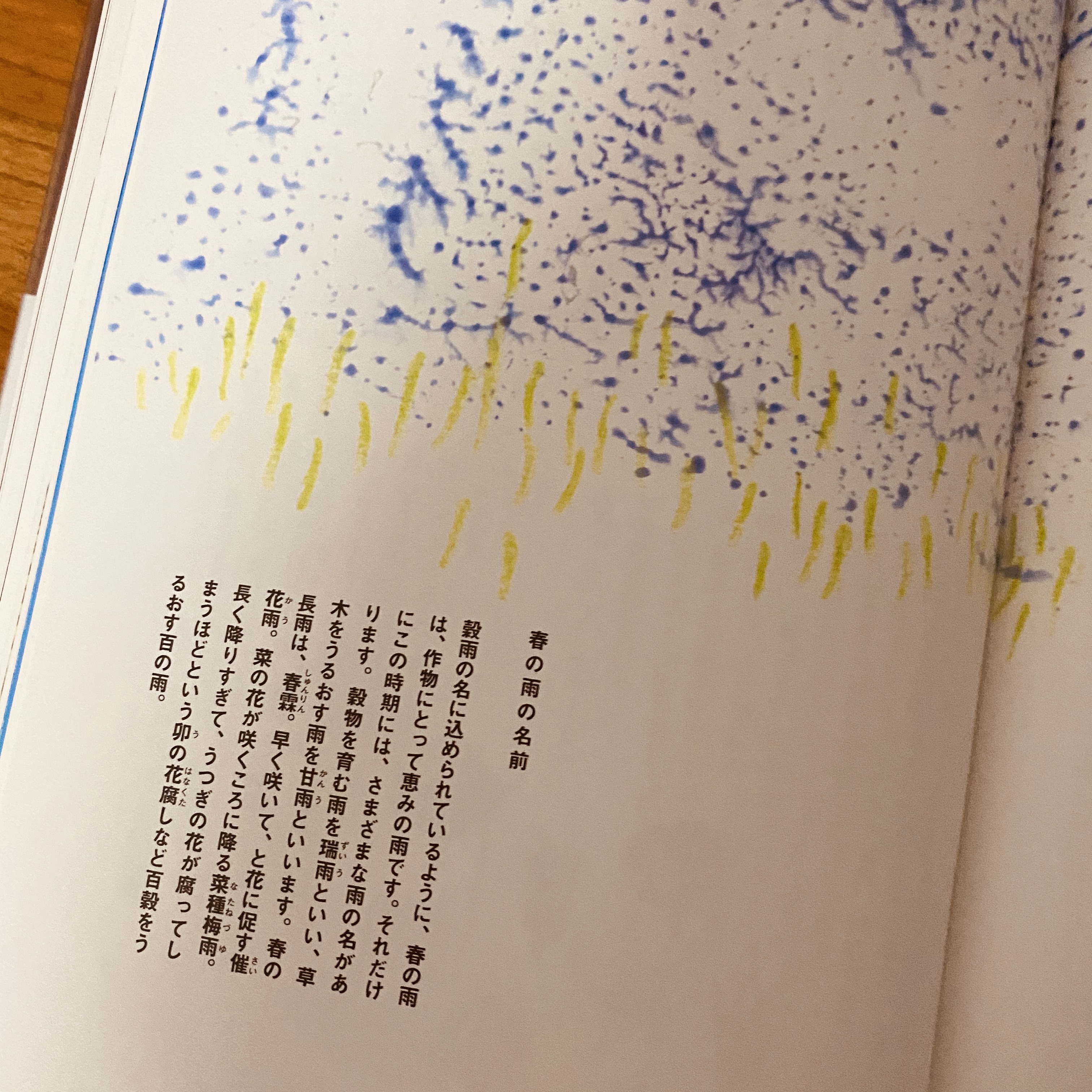 关于春天的雨,它还有许多好听的名字。孕育谷物的雨叫「瑞雨(すいう)」;润泽草木的雨叫「甘雨(かんう)」; 春的长雨,叫「春霖(しゅんりん)」;让花盛放的雨叫「花雨(かう)」。菜花开花时的雨叫「菜種梅雨(なたねづゆ)」。