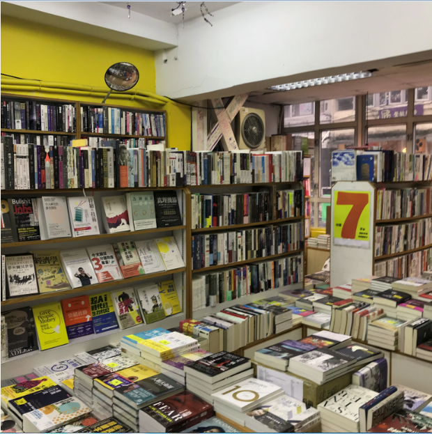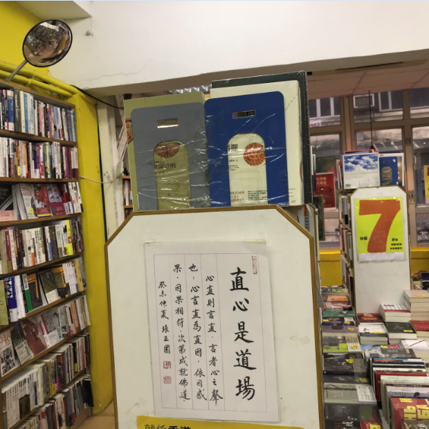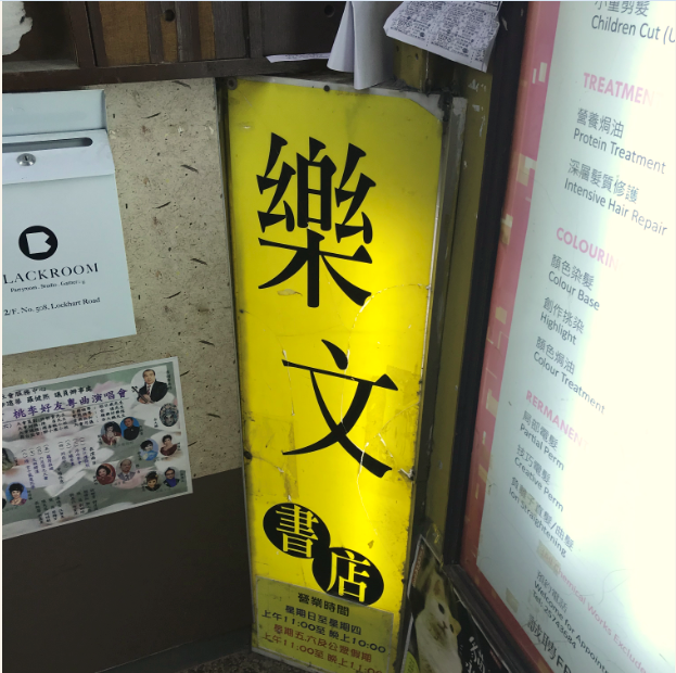 乐文书店是一间处于铜锣湾闹市区的楼上书店。当我沿着地图去找的时候,几次到了地图所指示的目的地,可我仍然找不到它,后来反反复复,才最终在一个极为不显眼的地方看到它的招牌,也就是如图的一个破破烂烂发着黄色亮光的立在楼梯旁的一个招牌。沿着楼梯走上去,能看到墙壁上贴了各式各样的书的海报。书店的内饰没有丝毫设计可言,但站在里面看书,找书,莫名让我仿佛穿越了十多年回到最原始的书店。在那里的短短两个小时,很惬意。因为封闭的原因,也几乎听不到窗外的各种响声。想想看过那么多设计精美的书店,在这里,却感觉找到了书店的原样和书的本样。