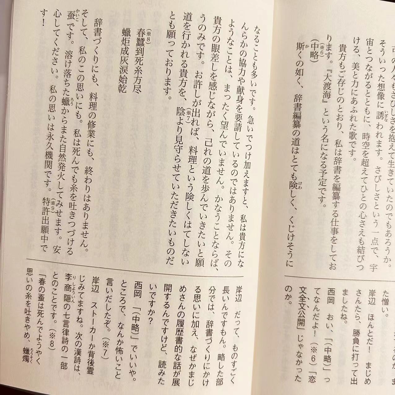 小说还特地写了编撰者馬締光也的恋爱故事,收录了他写的艰涩又深情的恋文。读完恋文,也是无端心动。他把自己献身于编撰辞典的心以及想要爱一个人的心情都明明白白地表露出来了。一往情深,既是他对恋人的爱,也是他对辞典的爱。