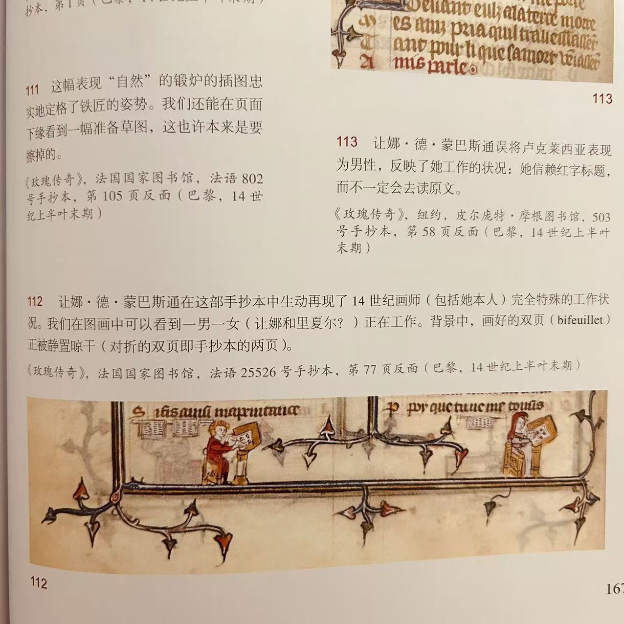 书中写到,《玫瑰传奇》在商业上能取得成功得益于14世纪巴黎的插画家族,里夏尔·德·蒙巴斯通和让娜·德·蒙巴斯通的抄写工坊。上图,让娜·德·蒙巴斯通再现了14世纪画师的工作状态,这或许就是他们两人的样子。左上角的背景里,还有画好的双页正被静置晾干。不由得让人感叹这样的细致和创意。
