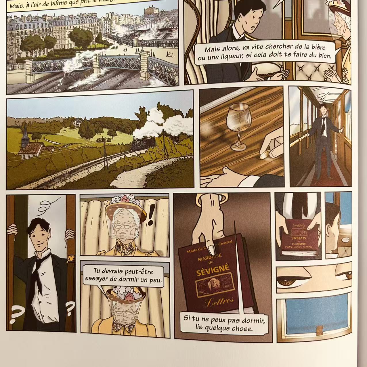 因为普鲁斯特的《追忆》而认识的塞维涅夫人也是我阅读过程中的一大收获。《追忆》里「我」的祖母是塞维涅夫人(Madame de Sévigné)的书信集的忠实读者,无论到哪里她都会随身携带这本书,也会时不时引用信中的句子。上图描写的是,我与祖母乘坐火车出发到Balbec,途中祖母建议说如果不睡觉的话,可以读点什么,于是把这本书信集递给「我」。