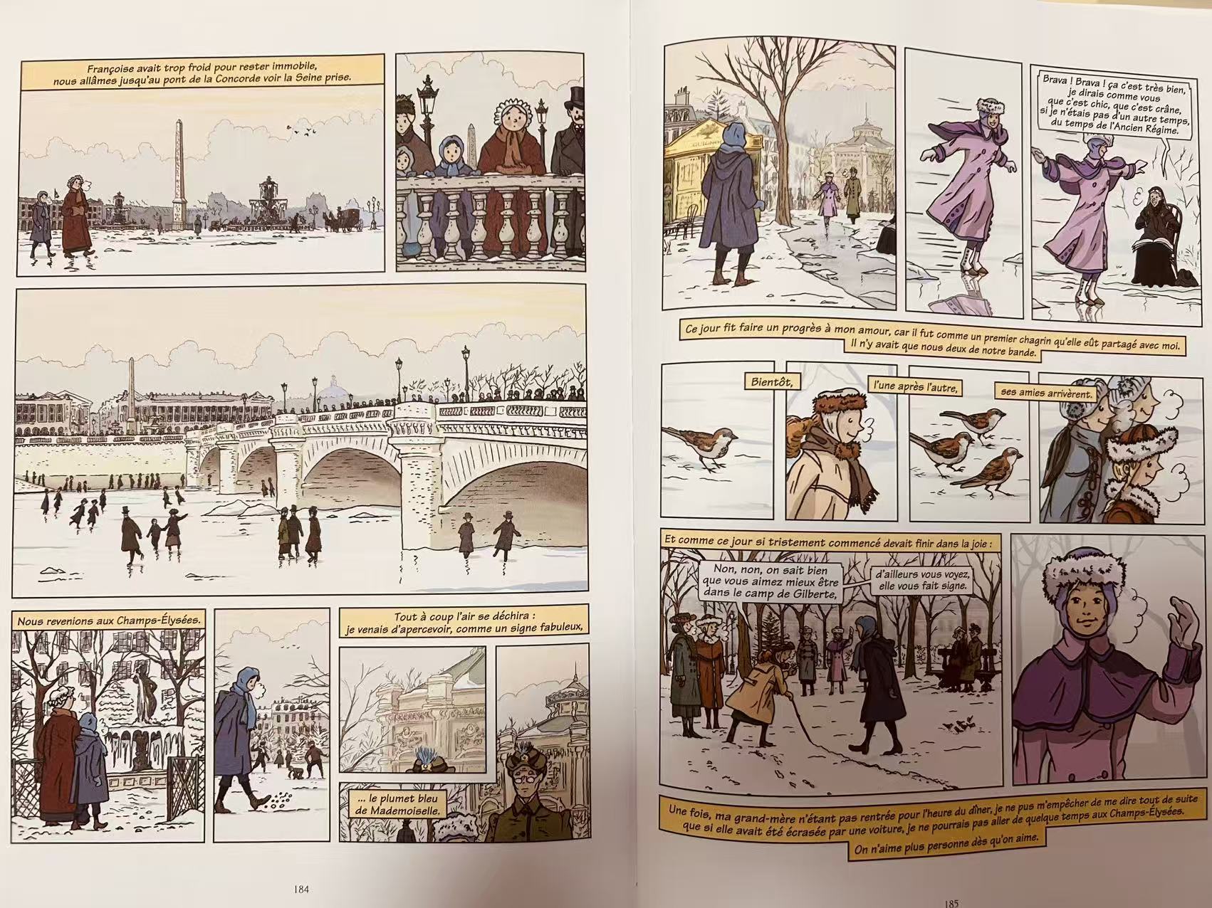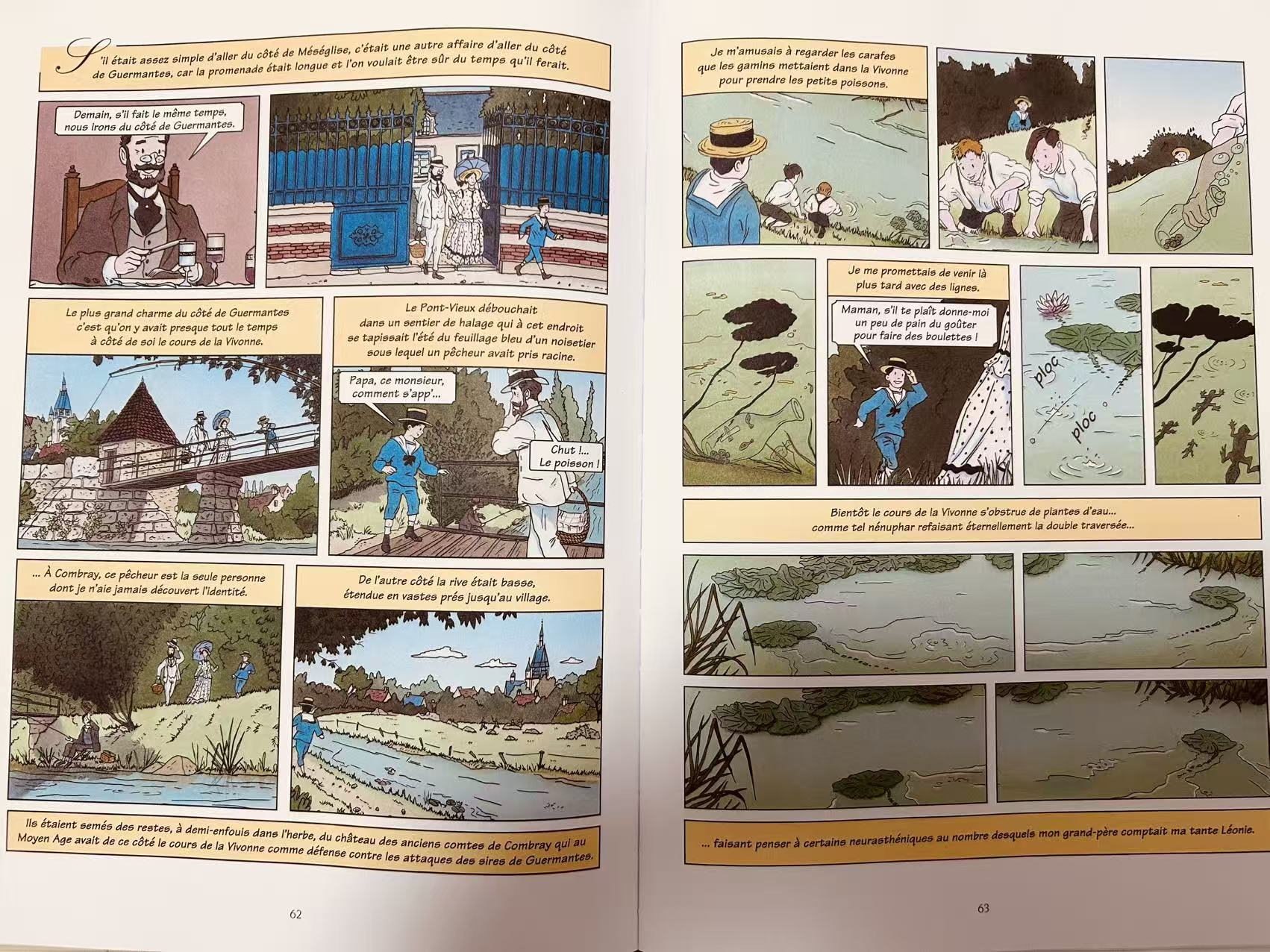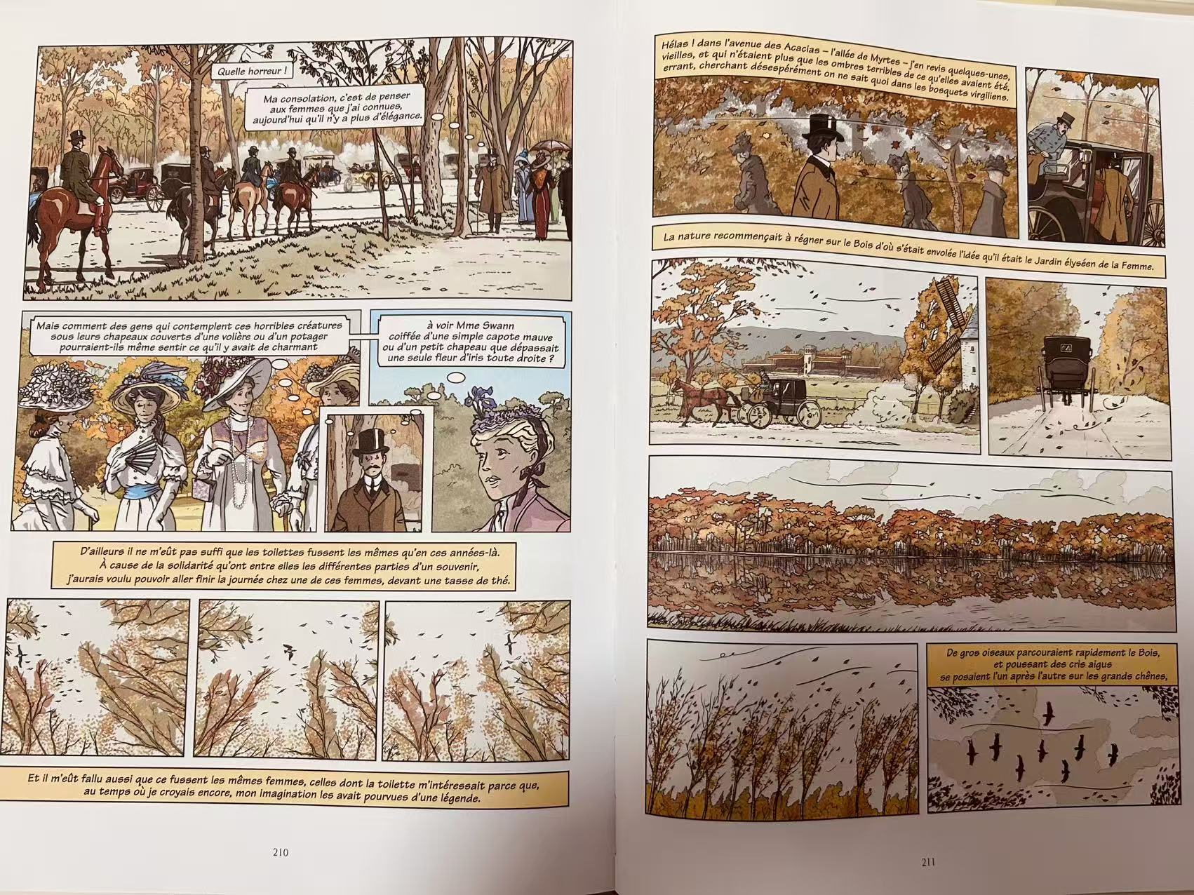 仅仅在一两本别的书以后,我再度回到它的身边,就像我以前说过的,读《追忆》,没有完结的时分。这一次,我终于可以敞开胸怀,没有负担地欣赏漫画版的它。因为知晓了来龙去脉,也得益于内心收藏了整一个小说文本的底气,让我无论翻到漫画版的哪一页,我都能想起它在书的哪一个地方,而它所呈现出来的光影色彩又丰富了原文的底色,可以说,此刻,读着漫画版,我感到无比欢喜。再有,它从原文里抽取出来的一句句法语也让我可以卸下暂时无法完全读法语原文的心房,而只是静静观赏这一时一刻的美丽句子。