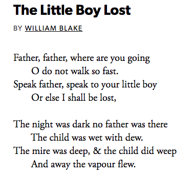 William Blake是18到19世纪的一位英国诗人。我对他的了解不多,光从诗面上看,它直抒胸臆般表达了一个儿子对父亲那濒临绝望的呼喊。眼前猛地就出现了一片黑乎乎的天,底下是一个孤零零的少年,他不是声嘶力竭地呼求,而是一把低沉沉的声音,他肯定累了,这不是他的第一次呼喊,也有可能不是最后一次。抑或说,他时常这样呼喊,像一种病,它会有发作的时候。他仿佛也知道没有父亲这个人物,又或者说父亲曾出现过但永远消失了。在他的影像里,即便前方闪烁着父亲的朦胧的身影,父亲也没有回头,更不会跟他说话。如一面会走动的墙,它是冷漠的。如此这般绝望的呼喊,该是多么的无助。少年迷失了。带着悲怆的心情。