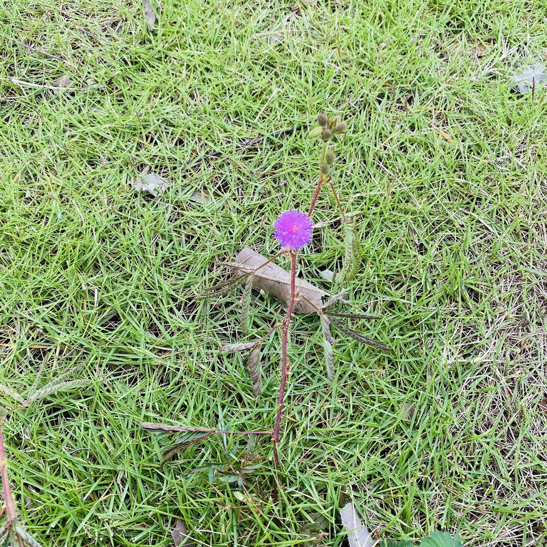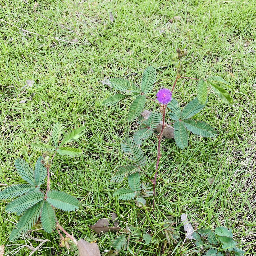 回去的路上,猛地看到有含羞草。许久不见含羞草了,我兴冲冲地蹲下碰碰它,果然,一碰,它就害羞并且把身子合起来了。