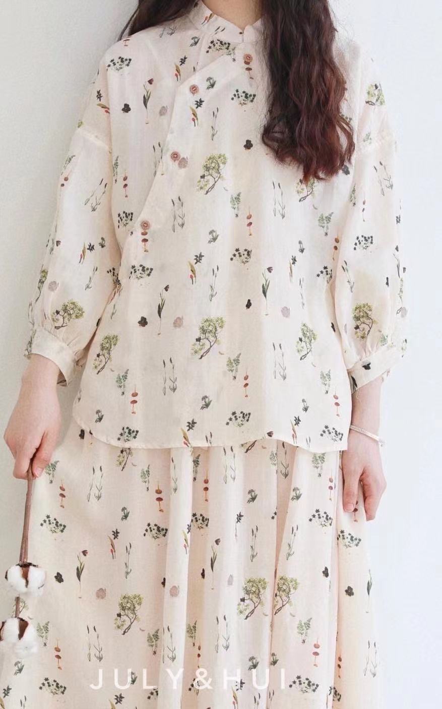 收到前阵子买的一套裙子(如图·模特图),正是符合这个可能的。它吸引我的地方除了是苎麻质地带植物印花以外,还有它的中式款上衣,很悠然的感觉。看着它,便开始想象它的搭配了。穿一套是舒适悠然的,印花上衣可以配白裙子,而白衬衫又可以配印花裙子,如此它便有了三种穿着可能了。