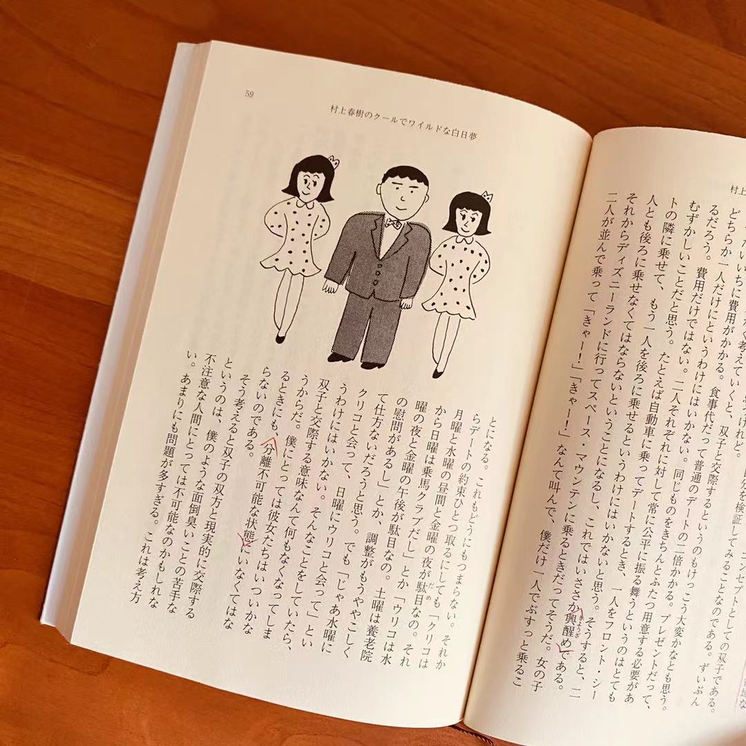 说到双胞胎,忘不了的是村上春树曾在随笔集《村上朝日堂はいほー!》里写过一篇文章《村上春樹のクールでワイルド白日夢(村上春树的冷酷又狂野的白日梦)》,里面他提到自己一个持续了二十年的白日梦——「拥有一对双胞胎女朋友。双胞胎女孩双方都等价地成为我的女朋友。」