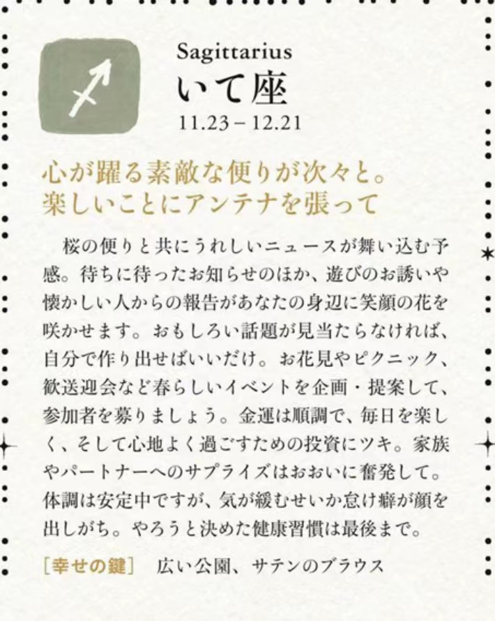 与樱花同期到访的令人开心的消息纷至沓来的预感。等待已久的消息,游玩的邀请,以及来自想念的人的报告都将在你身边陆续开花。若是找不到有趣的话题,不如自己创造吧。