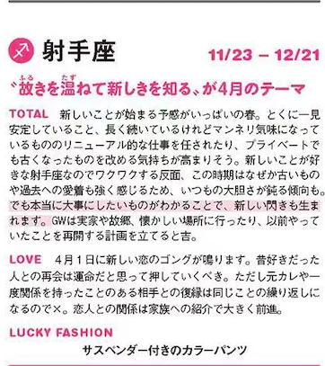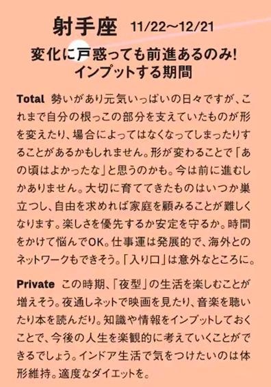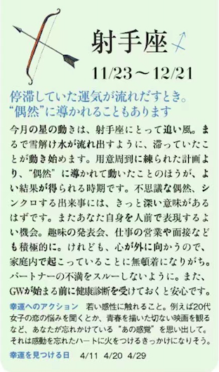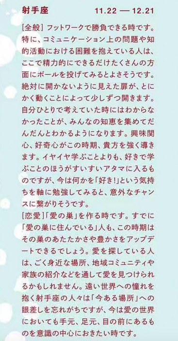 对遥远世界抱有憧憬的射手座很容易忘记注目于「当下的地方」,然而,现今即便是爱的世界,也要以手心,脚下,眼前作为意识的中心。