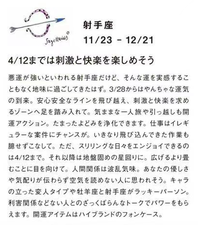 恶运连连的射手座,本该无此意识般踏踏实实度过的,然而从3/28日起淘气般的运气就会到来。飞越安心安全的界限,踏入寻求刺激和快乐的空间。能够净化累积的沉淀。然而,享受兴奋的日子到4/12就会结束。人际关系颇有纠纷。与没有利害关系的人坦率交流可获得能量。